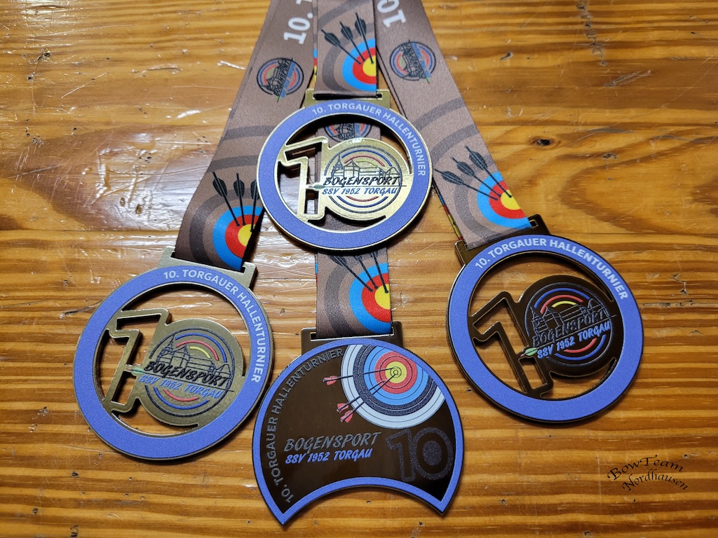 Eine Besonderheit dieses Turniers ist es, dass neben Vereinsmannschaften auch vereinsübergreifende Mannschaften gebildet werden können. Susanne Walther tat sich mit Bogensportlern aus Döbeln, Erfurt und Berlin zu zwei Mannschaften zusammen, die am Ende mit Platz 4 und Platz 3 sehr gut dabei waren. Somit ging ein Drittel der Bronzemedaille der Mannschaften „Bögen ohne Visier“ nach Nordhausen, denn jede Mannschaft erhält nur eine Medaille, von der jeder Schütze der Mannschaft ein Drittel bekommt.